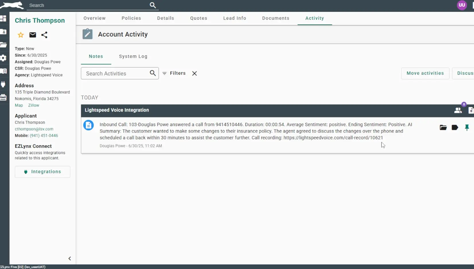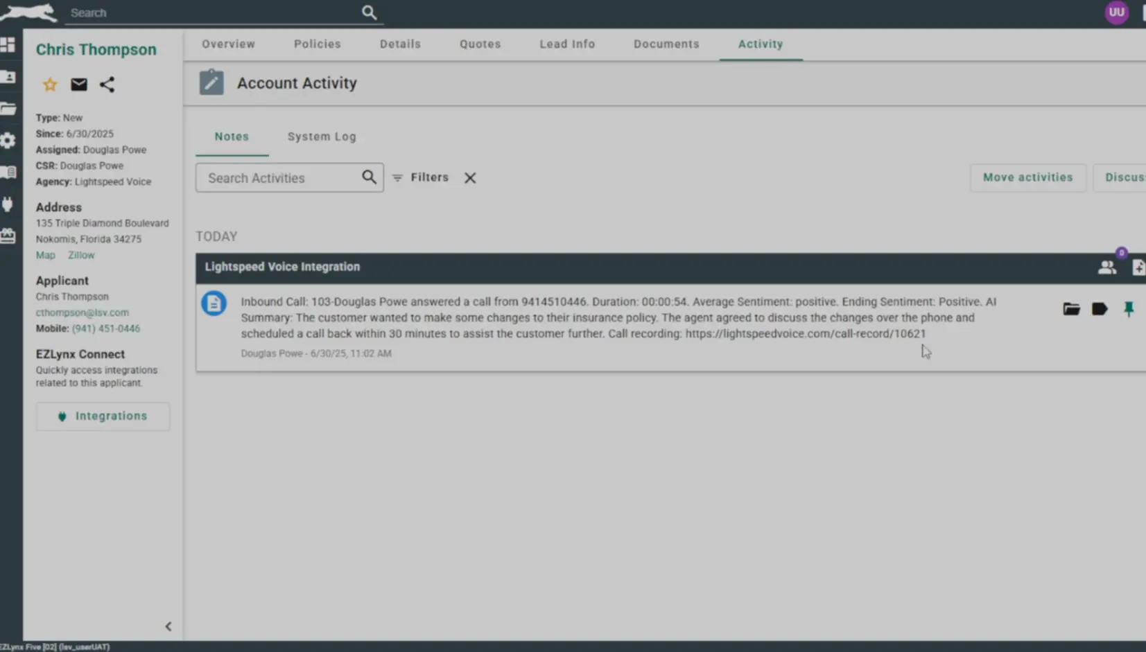 Lightspeed Voice integrates directly with EZLynx so calls, recordings, transcripts, and AI summaries automatically attach to the correct client record. Agents can click to call from inside EZLynx and see caller details instantly for incoming calls without switching screens.